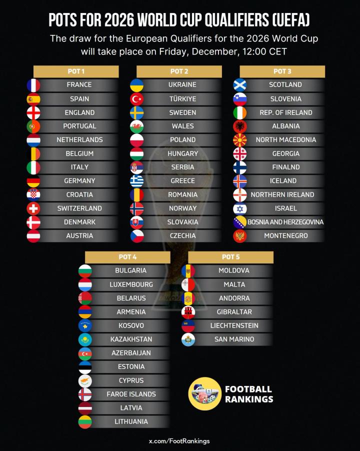 世界杯欧洲区预选赛分档:法西英葡荷比意德一档,挪威二档