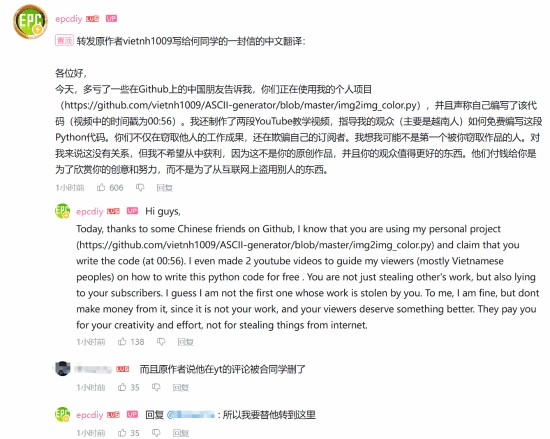 值得注意的是,有网友在epcdiy评论区留言称,“原作者说他在国外视频平台的评论被何同学删了”,epcdiy回复“所以我要替他转到这里(指B站)”。