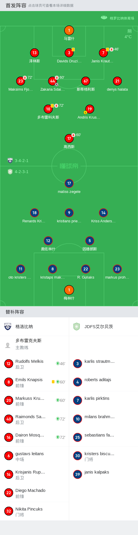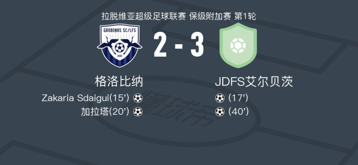 在拉脱维亚超级足球联赛保级附加赛的首轮较量中,格洛比纳坐镇主场迎战JDFS艾尔贝茨。比赛中,格洛比纳的Zakaria Sdaigui率先为球队打开局面,随后加拉塔也为主队贡献了一粒进球。然而,JDFS艾尔贝茨展现了强大的进攻实力,接连打入三球,最终以3比2逆转战胜格洛比纳。