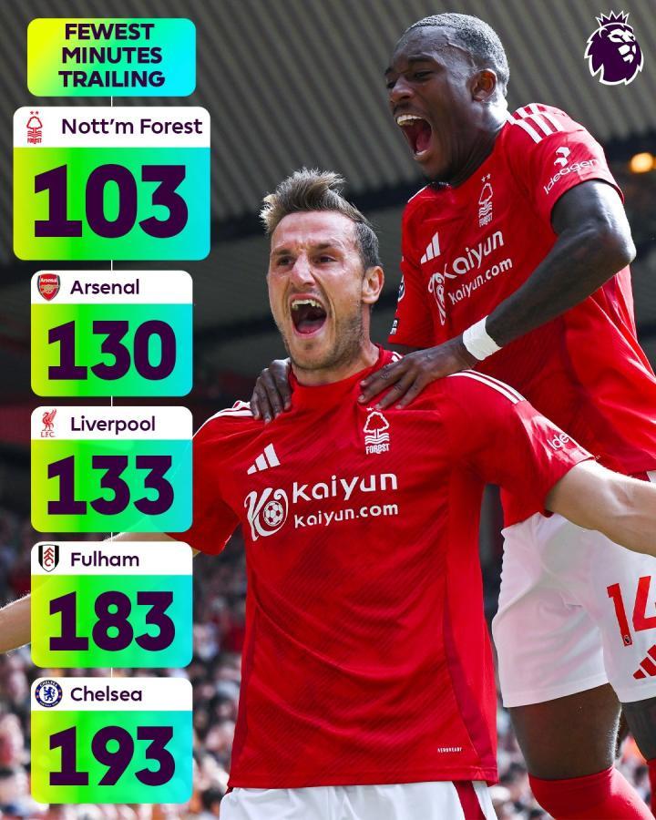 103分钟,诺丁汉森林是本赛季英超落后时间最短的球队四条腿的车 @懂球帝2024-11-21 03:41诺丁汉森林在本赛季11轮英超联赛过后暂时排名第5,一些数据也验证了他们的出色表现。根据英超联赛官方公布的数据,诺丁汉森林在本赛季的这11场比赛中只有103分钟处于比分落后的状态,在20支参赛球队当中都是最少的。本赛季英超联赛前11轮比分落后时间排行榜诺丁汉森林 103分钟阿森纳 130分钟利物浦 133分钟富勒姆 183分钟切尔西 193分钟展开更多