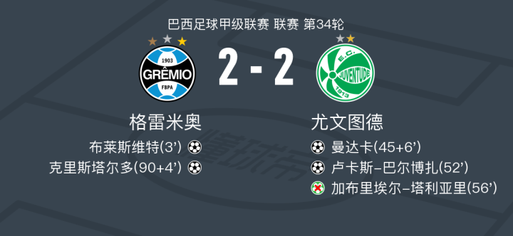 格雷米奥2-2尤文图德,布莱斯维特破门,克里斯塔尔多扳平比分