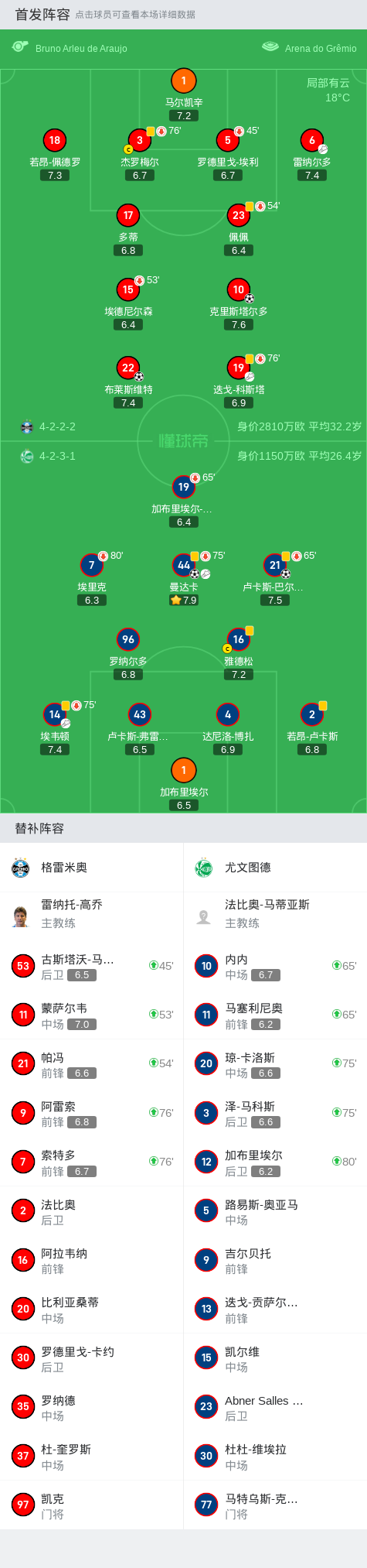 下半场补时第4分钟,格雷米奥球员雷纳尔多助攻克里斯塔尔多打入一球。