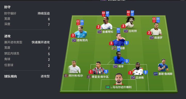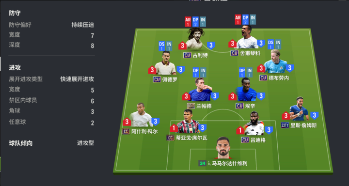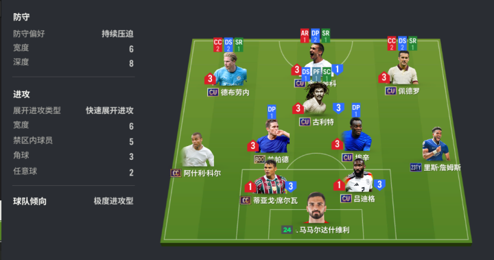 这个阵型有很大优点是,常规进攻时,就可以用4213站位,切到压迫的4213,球员的位置不需要调整,可以第一时间参与到压迫防守中。