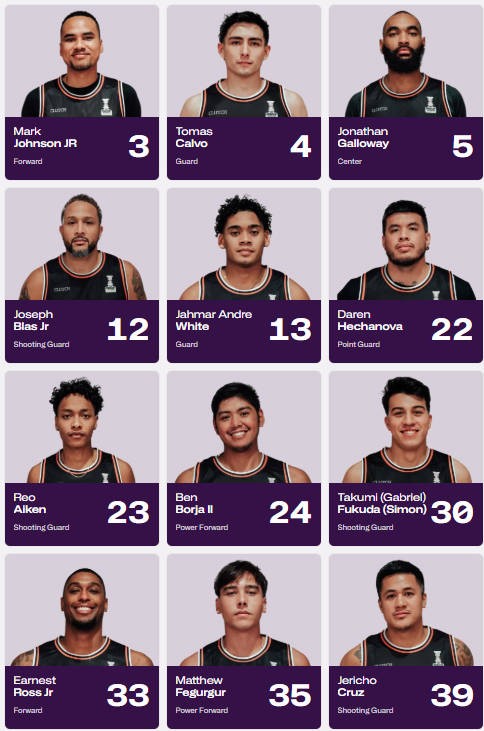 关岛男篮的四名职业球员分别是叫厄内斯特-罗斯 ,曾在NCAA奥本大学和密苏里大学中效力,大学生涯场均数据为10.1分5.2篮板1.3助攻,也曾在NBA发展联盟南湾湖人队效力过。此外乔纳桑-盖洛威曾效力于加州大学,场均数据为4.4分6.6篮板,如今在欧洲联赛效力。第三位球员是托马斯-卡尔沃,曾效力于加州路德大学,如今在本土联赛效力。第四位是贾马尔-怀特,目前在宾州州立大学阿尔图纳分校效力。