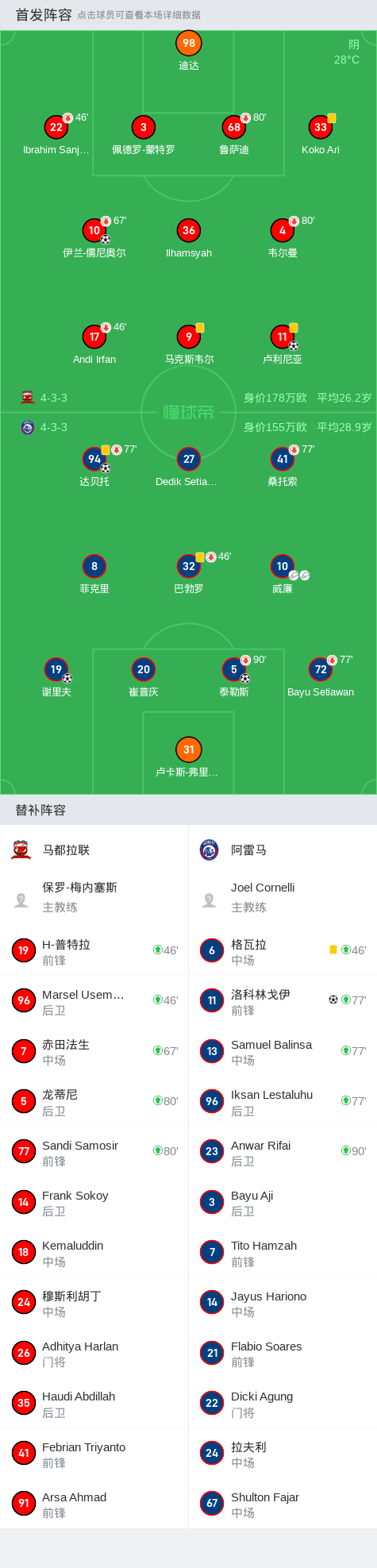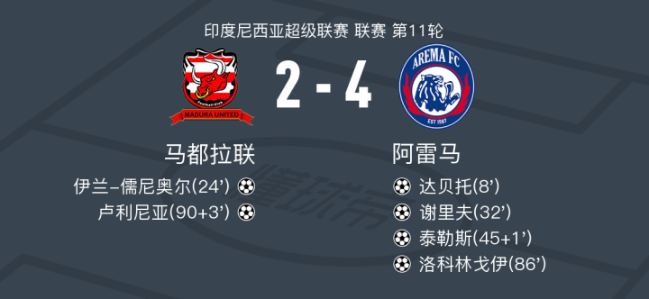 在印度尼西亚超级联赛第11轮的较量中,马都拉联坐镇主场迎战阿雷马。比赛中,阿雷马的达贝托率先为球队取得领先。随后,马都拉联的伊兰-儒尼奥尔迅速扳平比分。然而,阿雷马的谢里夫再次帮助球队取得领先,紧接着泰勒斯在威廉的助攻下扩大了优势。比赛接近尾声时,威廉再次送出助攻,洛科林戈伊为阿雷马再添一分。尽管马都拉联的卢利尼亚在比赛最后阶段打入一球,但最终未能改变比赛结果。最终,阿雷马以4比2战胜马都拉联,取得了这场比赛的胜利。