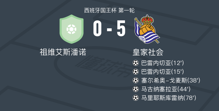 皇家社会5-0横扫祖维艾斯潘诺,巴雷内切亚两球,马里耶斯库雷纳破门