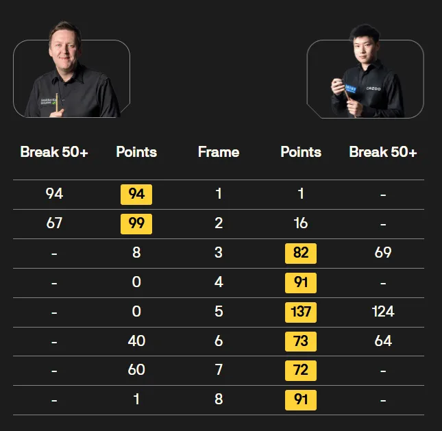 本场比赛,里奇-沃顿率先打出单杆94和67分,赵心童随后不遑多让打出单杆124、69、64分,六连鞭完成逆转。