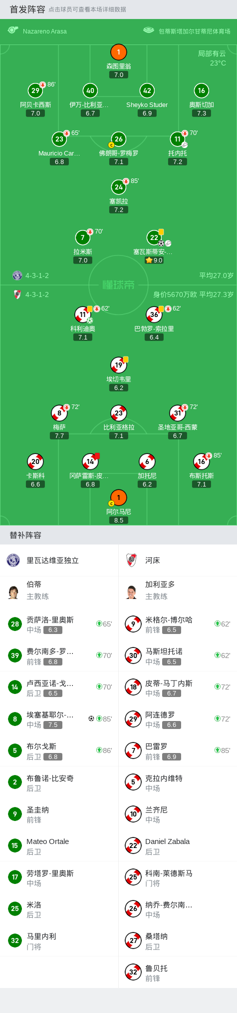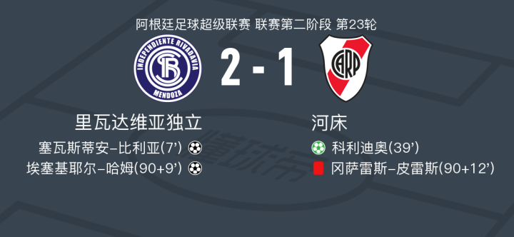 里瓦达维亚独立2-1河床,埃塞基耶尔-哈姆破门,塞瓦斯蒂安-比利亚建功