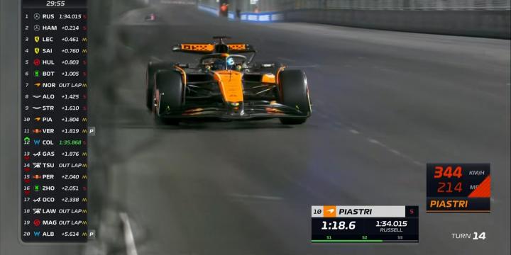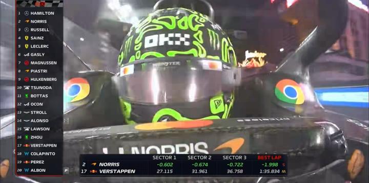 二练停表,后续成绩无变化,转播方也是给出了诺里斯与维斯塔潘本场的差距!