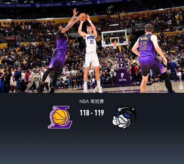NBA常规赛湖人主场迎战魔术。末节詹姆斯连轰三记三分拉开分差,魔术小瓦格纳连续得分再度反超,关键时刻詹姆斯站出来再度领先胜券在握,魔术采取犯规战术,但湖人詹姆斯、浓眉接连丢罚球,浓眉最后两罚全丢最为致命,小瓦格纳三分准绝杀,最终湖人118-119不敌魔术,结束6连胜。