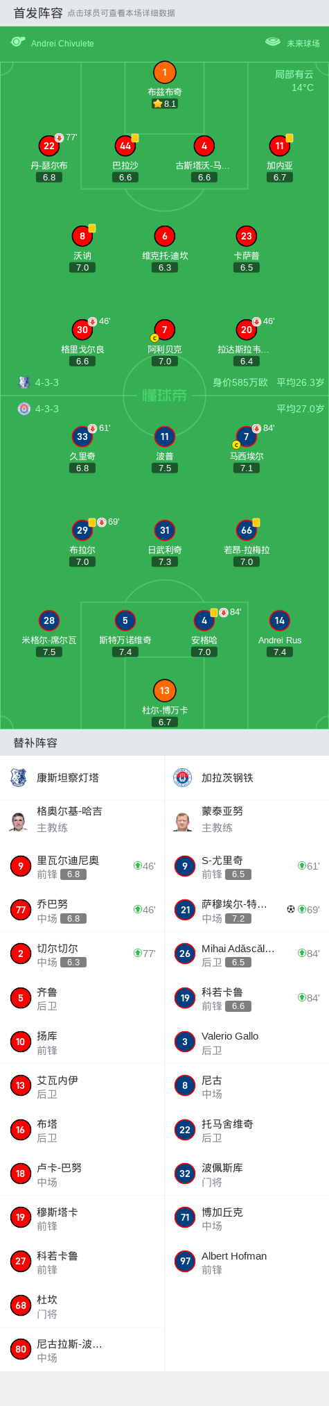 下半场补时第5分钟,加拉茨钢铁球员萨穆埃尔-特莱斯打入一球。