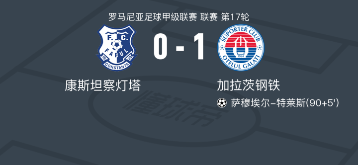 在罗马尼亚足球甲级联赛第17轮的较量中,康斯坦察灯塔坐镇主场迎战加拉茨钢铁。比赛中,加拉茨钢铁的萨穆埃尔-特莱斯成功破门,为球队取得领先。最终,加拉茨钢铁以1比0小胜康斯坦察灯塔,客场全取三分。