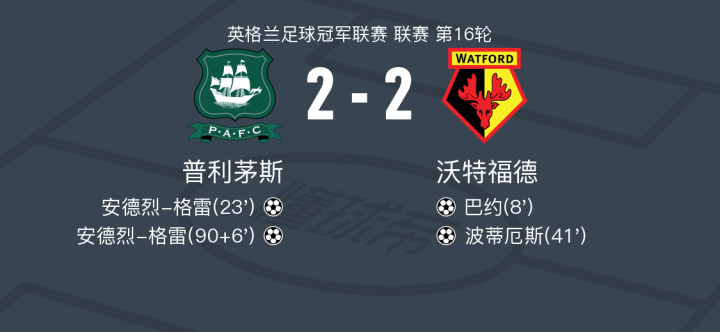 普利茅斯2-2沃特福德,巴约破僵,安德烈-格雷救主