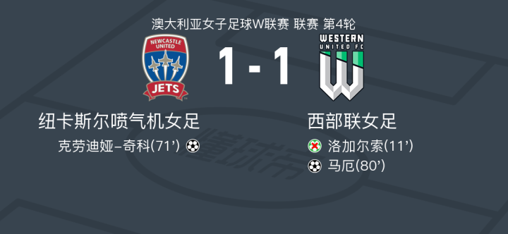 在澳大利亚女子足球W联赛第4轮的较量中,纽卡斯尔喷气机女足坐镇主场迎战西部联女足。比赛中,西部联女足的洛加尔索未能把握住点球机会。随后,纽卡斯尔喷气机女足的索菲-霍本送出精妙助攻,克劳迪娅-奇科成功破门,为主队取得领先。然而,西部联女足不甘示弱,萨莎-格罗夫助攻马厄扳平比分。最终,双方以1-1握手言和。