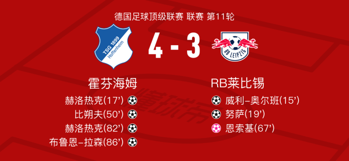 霍芬海姆vsRB莱比锡球员评分:布鲁恩-拉森8.5分,阿桑-韦德拉奥果5.7分