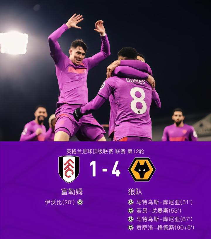 在英格兰足球顶级联赛第12轮的较量中,富勒姆坐镇主场迎战狼队。比赛中,富勒姆的伊沃比率先为球队取得进球。然而,狼队迅速展开反击,马特乌斯-库尼亚表现出色,贡献了两粒进球,并且还为若昂-戈麦斯送出了一次助攻。若昂-戈麦斯同样不甘示弱,助攻马特乌斯-库尼亚完成了他的第二个进球。比赛接近尾声时,贡萨洛-格德斯在尤尔根-拉森的助攻下再下一城。最终,狼队以4比1的比分战胜富勒姆,取得了这场比赛的胜利。