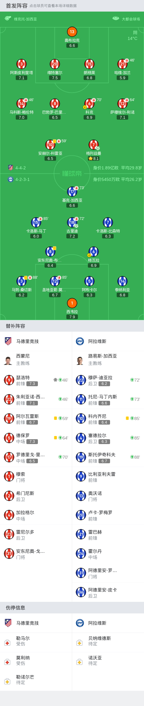 在西班牙足球甲级联赛第14轮的较量中,马德里竞技坐镇主场迎战阿拉维斯。比赛中,阿拉维斯的古里迪率先通过点球为球队取得领先。随后,马德里竞技的格列兹曼同样以点球方式扳平比分。接近比赛尾声时,德保罗送出精彩助攻,瑟洛特成功破门,帮助马德里竞技反超比分。最终,马德里竞技以2-1战胜阿拉维斯。