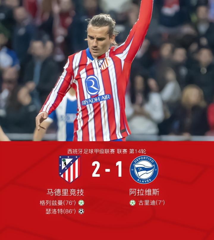 马竞2-1逆转阿拉维斯,德保罗助攻瑟洛特绝杀,格列兹曼点射