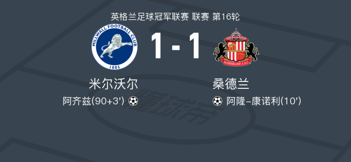 在英格兰足球冠军联赛第16轮的较量中,米尔沃尔坐镇主场迎战桑德兰。比赛中,桑德兰的阿隆-康诺利率先为球队取得进球。随后,米尔沃尔的阿齐兹在埃马库的助攻下扳平比分。最终,双方以1-1握手言和。