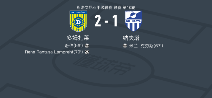 在斯洛文尼亚甲级联赛第16轮的较量中,多姆扎莱坐镇主场迎战纳夫塔。比赛中,多姆扎莱的洛伯率先为球队取得领先。随后,纳夫塔的米兰-克劳斯扳平比分。比赛接近尾声时,Rene Rantusa Lampreht为多姆扎莱再度建功,帮助球队锁定胜局。最终,多姆扎莱以2-1战胜纳夫塔,成功捍卫主场荣耀。
