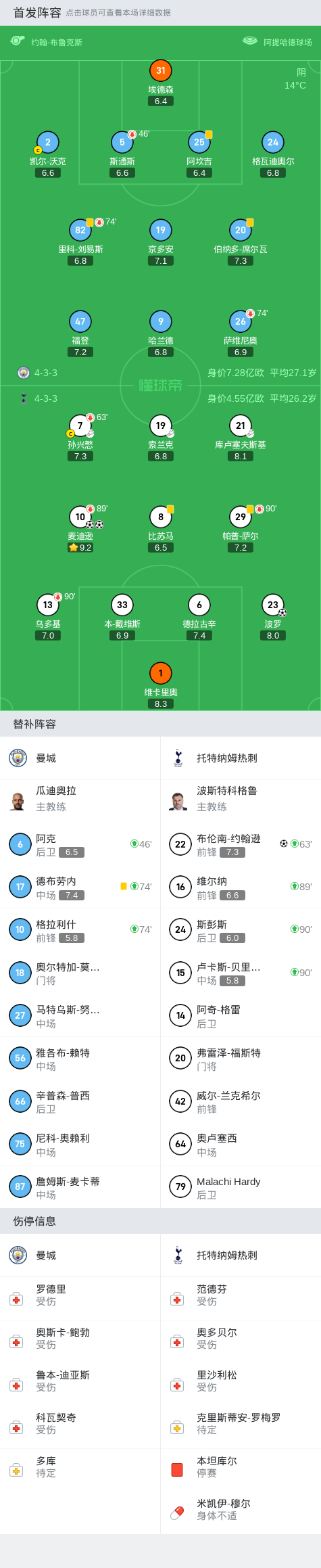 第74分钟,格拉利什、德布劳内替补上阵,换下里科-刘易斯、萨维尼奥