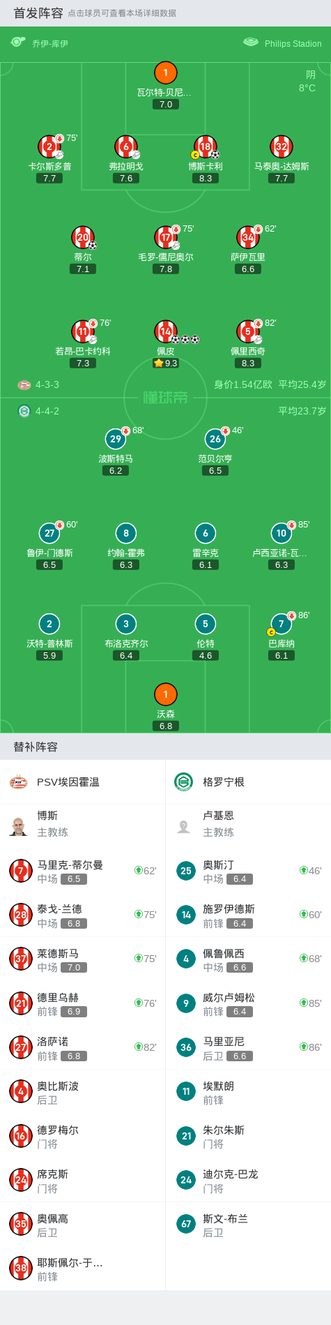 在荷兰甲级联赛第13轮的较量中,PSV埃因霍温坐镇主场迎战格罗宁根。比赛中,PSV埃因霍温展现了强大的进攻实力。博斯卡利率先为球队打开局面,随后佩皮上演了精彩的帽子戏法成为比赛的焦点。蒂尔也为球队锦上添花贡献了一粒进球。最终,PSV埃因霍温以5-0的比分大胜格罗宁根,取得了一场酣畅淋漓的胜利。