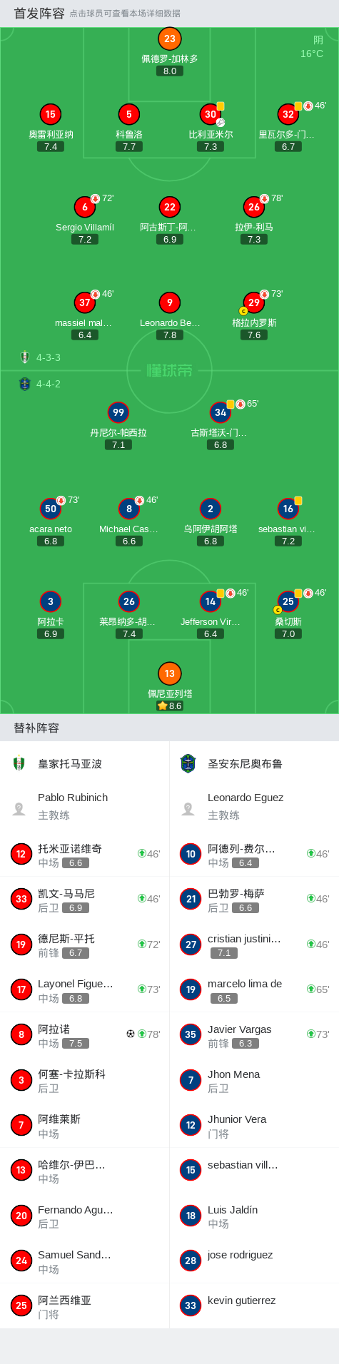 下半场补时第2分钟,皇家托马亚波球员比利亚米尔助攻阿拉诺打入一球。