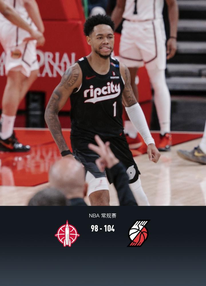 第四节火箭申京拿下8分,开拓者安芬尼-西蒙斯拿下15分,最终火箭98-104不敌开拓者