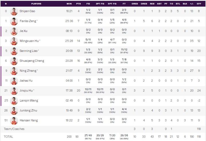 数据方面,中国男篮胡金秋11中10得20分5板,胡明轩14分4板2助,廖三宁13分9板3助,程帅澎16分。