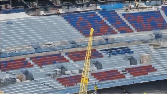 近日,诺坎普的翻新工程已经已经有了显著的进展,可以看到,第二层看台上已经安装了一大部分座椅,Spotify的标志几乎已经完全显现出来。