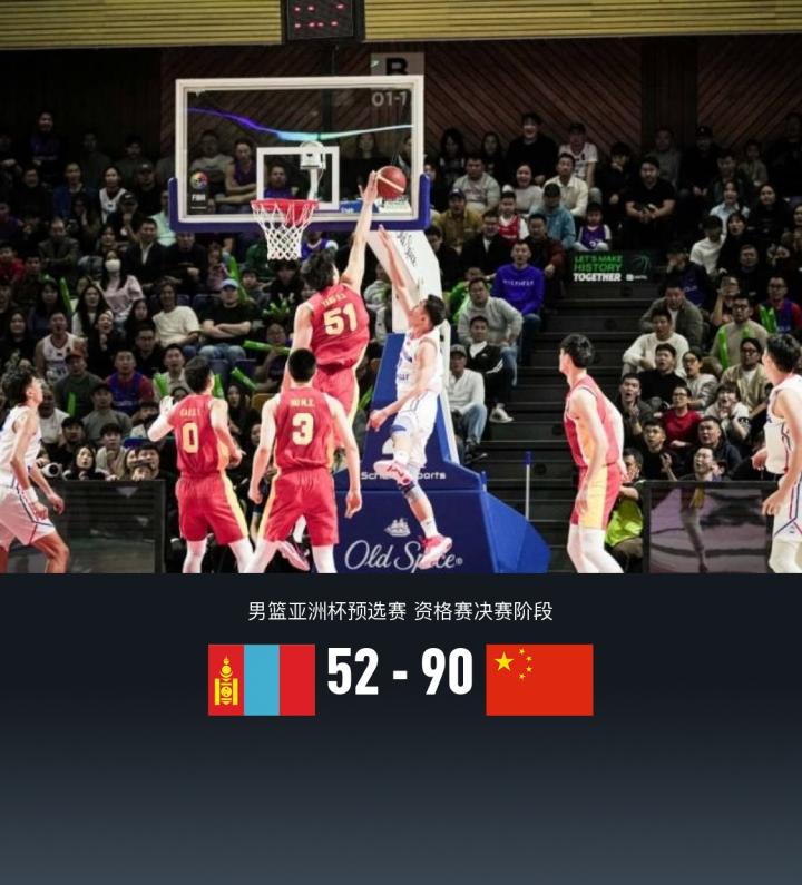 男篮亚洲杯预选赛中国男篮小组赛第四场客场对阵蒙古。最终中国男篮90-52大胜蒙古。目前3胜1负仍排在小组第二!