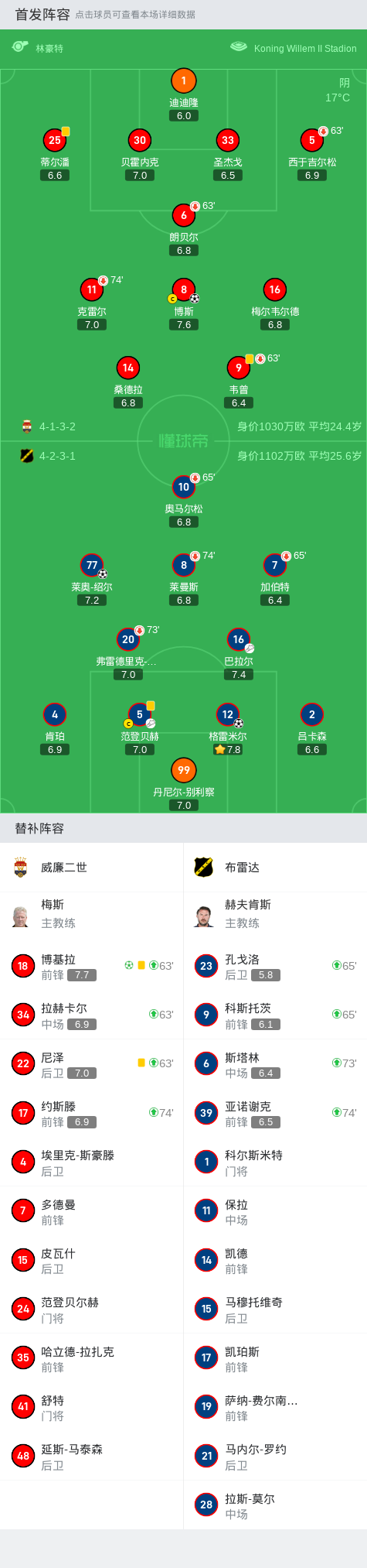 在荷兰甲级联赛第13轮的较量中,威廉二世坐镇主场迎战布雷达。比赛中,布雷达的巴拉尔为莱奥-绍尔送出助攻,帮助球队率先取得进球。随后,范登贝赫助攻格雷米尔,再次为布雷达扩大领先优势。威廉二世不甘示弱,博斯为球队扳回一城。比赛接近尾声时,博基拉稳稳罚入点球,为威廉二世将比分扳平。最终,双方以2-2握手言和。
