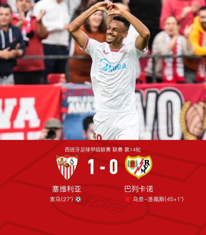 塞维利亚1-0十人巴列卡诺,索乌制胜,乌奈-洛佩斯染红