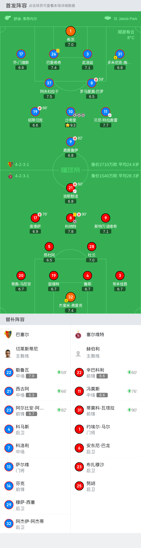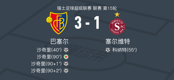 在瑞士足球超级联赛第15轮的较量中,巴塞尔坐镇主场迎战塞尔维特。比赛中,巴塞尔的沙奇里表现出色,上演了帽子戏法。塞尔维特方面,科纳特在吉耶默诺的助攻下为球队打入一球。最终,巴塞尔以3-1战胜塞尔维特,取得了比赛的胜利。