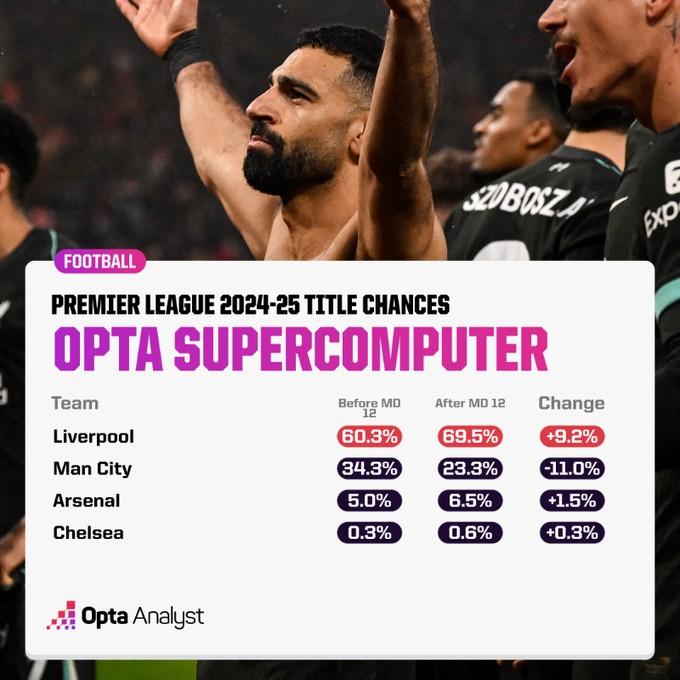 英超最新夺冠概率:利物浦升至69.5%,曼城降至23.3%