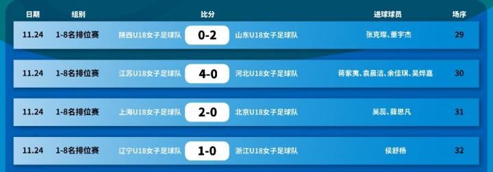 11月26日,全国三大球运动会女足四强对阵情况:山东女足vs江苏女足,上海女足vs辽宁女足。