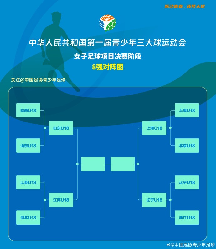 来自中国足协青少年足球官方微博播报,第一届全国青少年三大球运动会女子足球项目决赛阶段,上海队、山东队、江苏队、辽宁队晋级四强。