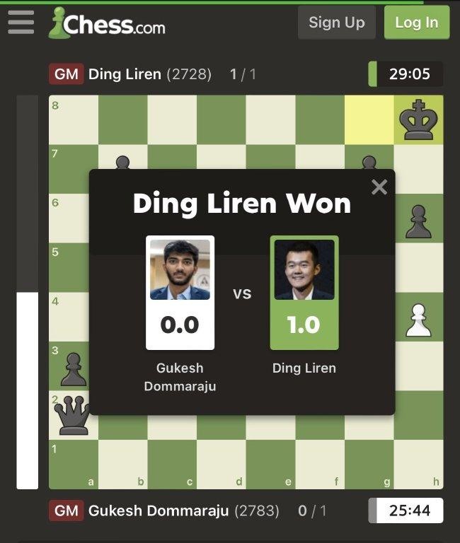世界冠军对抗赛在丁立人与挑战者古克什之间展开,赛前经过抽签丁立人首轮执黑,开局丁立人选择了法兰西防御,前15步丁立人表现的非常稳健,在此后走出了罕见的a5变化,挑战者古克什也是有备而来,但显然丁立人准备的更为充分,在g4走完之后的黑棋一步后a5成为本盘对局的亮点,此后白棋显得有些不知所措接连出现缓手,棋局进入到了黑棋操控的局面,在时间紧张的情况下,白棋后翼崩溃,黑棋强势出击,最终走完第42步,古克什停钟认输,丁立人率先拿下一分。