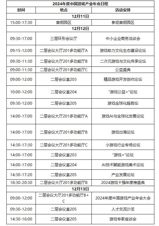 为促进中国游戏产业持续健康发展,全面总结一年来中国游戏行业整体情况,由国家新闻出版署主管,中国音像与数字出版协会主办,中国音像与数字出版协会游戏出版工作委员会承办的2024年度中国游戏产业年会将于2024年12月11日至13日在北京市石景山区首钢国际会展中心举办。