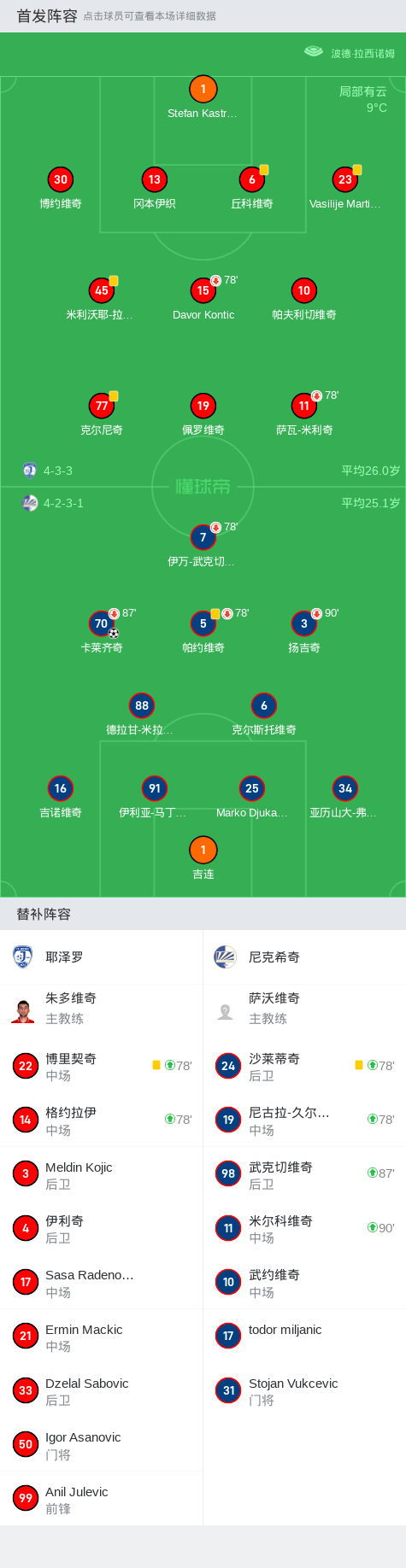 尼克希奇1-0耶泽罗,卡莱齐奇制胜球战报bot @懂球帝2024-11-25 22:51在黑山足球甲级联赛第17轮的较量中,耶泽罗坐镇主场迎战尼克希奇。比赛中,尼克希奇的卡莱齐奇成功破门,为球队取得领先。最终,尼克希奇以1比0小胜耶泽罗,客场全取三分。点击查看本场比赛详细数据>>点击查看黑山甲完整积分榜>>精彩瞬间第70分钟,尼克希奇球员卡莱齐奇打入一球。 球队阵容 技术统计 展开更多