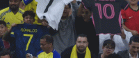 第23分钟,镜头给到看台,有球迷举C罗球衣,也有球迷举梅西球衣