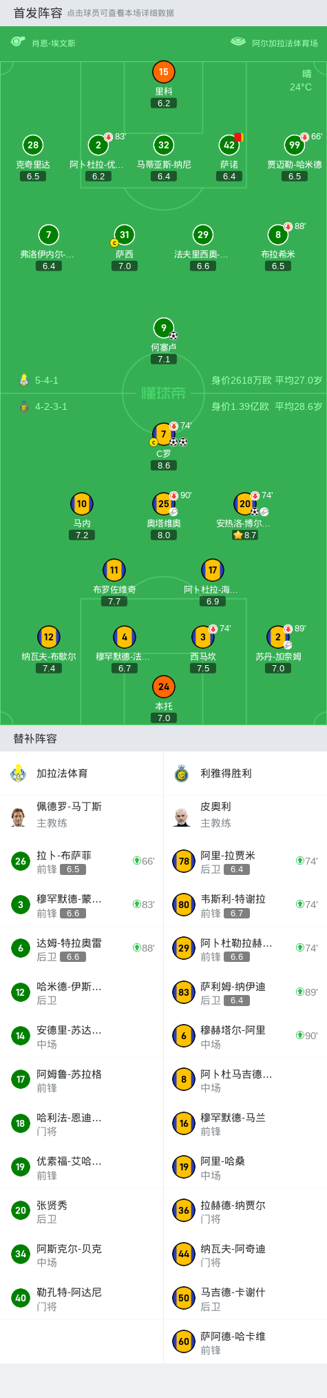 第74分钟,利雅得胜利换人,梅开二度的C罗下场休息
