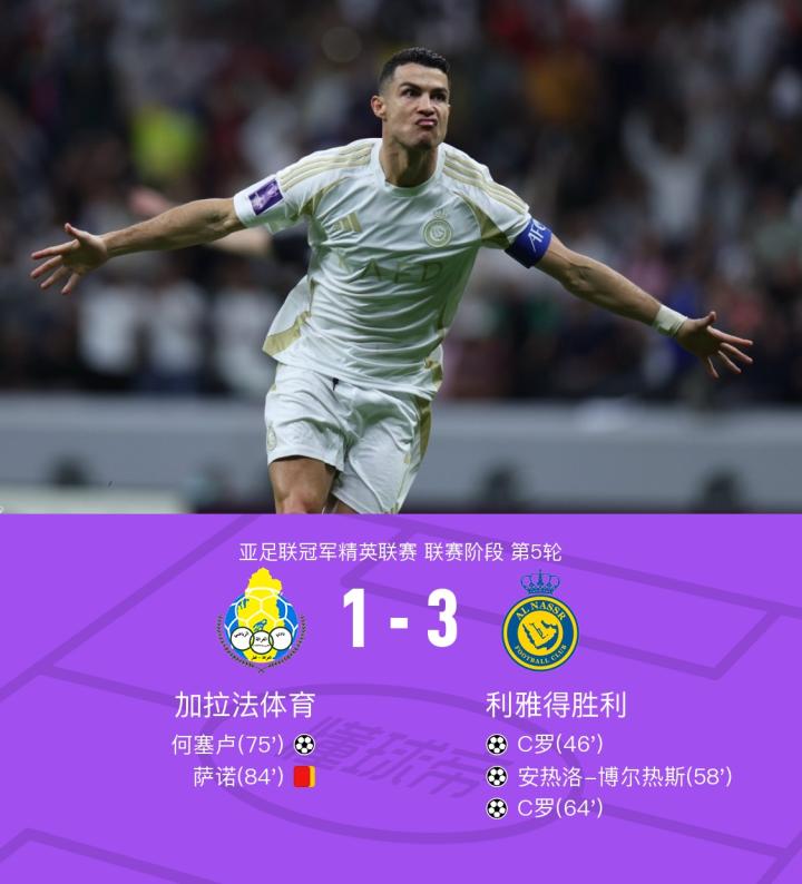 利雅得胜利3-1加拉法体育,C罗双响,安热洛传射,何塞卢破门