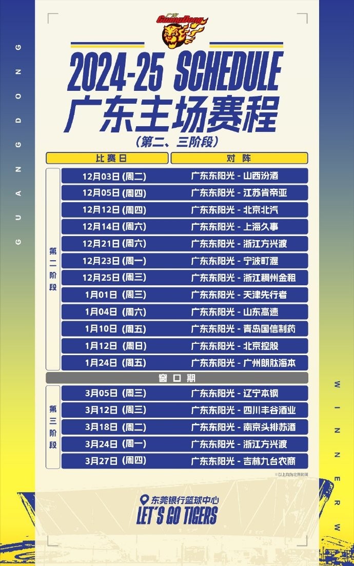 广东男篮第二、三阶段共17个主场比赛,共分为A、B、C、D四类档次。A类场次包括北京、广厦、辽宁,B类场次包括上海、浙江、青岛、北控,C类场次包括山西、天津、山东、广州、南京、吉林,D类场次包括江苏、宁波、四川。第二阶段广东男篮的主场揭幕战将于12月3日对阵山西男篮。