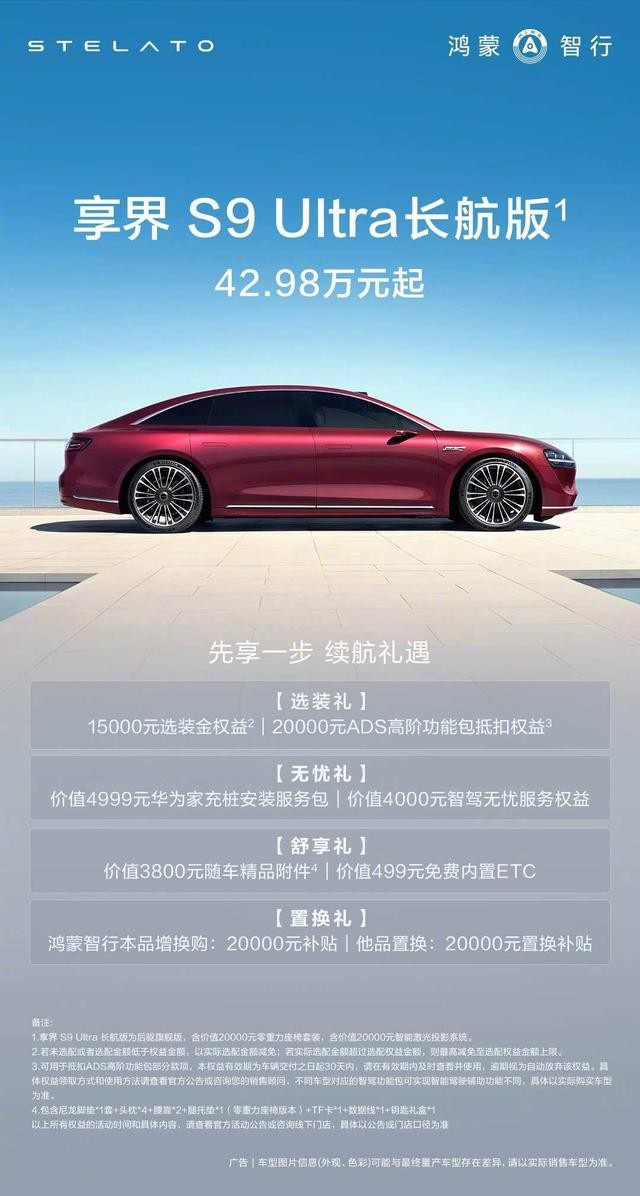 鸿蒙智行享界S9 Ultra 长航版,CLTC综合续航816km,售价42.98万元起。