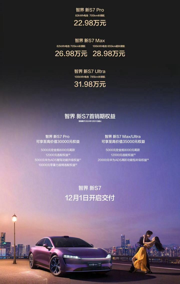 首先是鸿蒙智行智界新S7汽车,新款车型维持了封闭式的车头设计,带来新舒适、新颜值、新性能、新智能四大升级点,售价22.98万元起,12月1日开启交付。