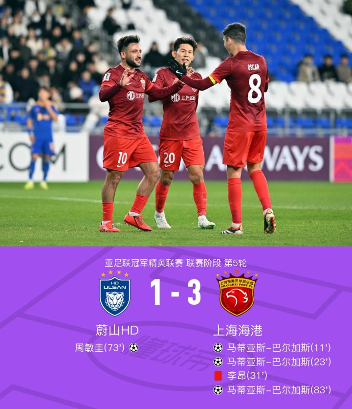 北京时间11月26日18:00,亚冠精英联赛阶段第5轮,上海海港作客蔚山文殊球场挑战蔚山HD,本场主裁判为纳沙鲁丁(马来西亚)。上半场,奥斯卡两度助攻巴尔加斯破门,李昂失误后犯规被直红罚下。下半场,周敏圭为蔚山扳回一城,随后奥斯卡又助攻巴尔加斯一条龙世界波锁定胜局。最终,十人海港3-1客胜蔚山。