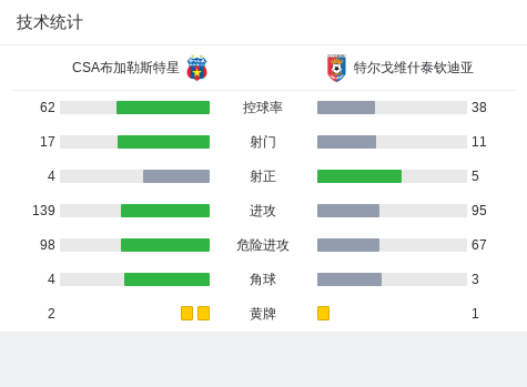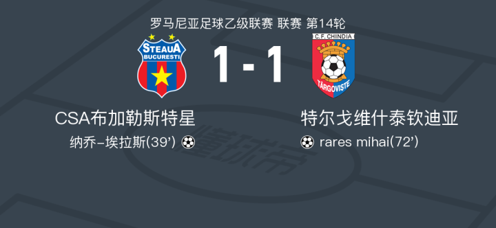 在罗马尼亚足球乙级联赛第14轮的较量中,CSA布加勒斯特星坐镇主场迎战特尔戈维什泰钦迪亚。比赛中,CSA布加勒斯特星的纳乔-埃拉斯率先为球队取得进球。随后,特尔戈维什泰钦迪亚的rares mihai也为客队扳平比分。最终,双方以1-1握手言和。