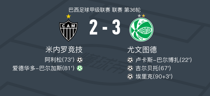 在巴西足球甲级联赛第36轮的较量中,米内罗竞技坐镇主场迎战尤文图德。比赛中,尤文图德的卢卡斯-巴尔博扎率先打破僵局,随后吉尔贝托再下一城,帮助球队扩大领先优势。米内罗竞技不甘示弱,爱德华多-巴尔加斯助攻阿利松扳回一城,并通过点球机会将比分扳平。然而,尤文图德的埃里克在比赛尾声阶段接到队友的传球,打入制胜一球。最终,尤文图德以3-2险胜米内罗竞技,取得了这场激动人心的胜利。