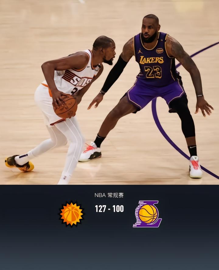 第四节,开节湖人连续尝试三分持续打铁,好在太阳这边命中率也有下滑,分差维持20分,湖人依旧不下主力,随后太阳杜兰特、布克联手将分差拉大至27分,最后4分半湖人彻底放弃挣扎换下主力,最终太阳127-100战胜湖人。
